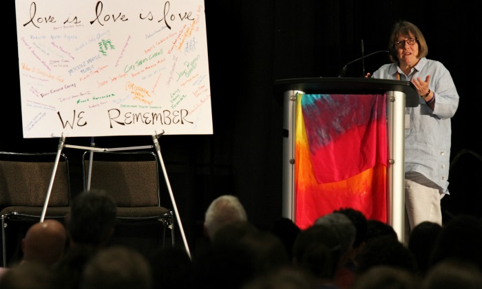 Goshen (Indiana) College, spoke on the importance of remembering those who died in the Pulse shooting, in the attack at the Emmanuel African Methodist Episcopal Church in Charleston, South Carolina (which claimed the lives of nine church members), and all the other victims of violence and hate in the world. She reminded the gathering, “We are created in the image of the one who created us and the one who created the universe,” and yet we live in a society that tries to exclude people from that image.