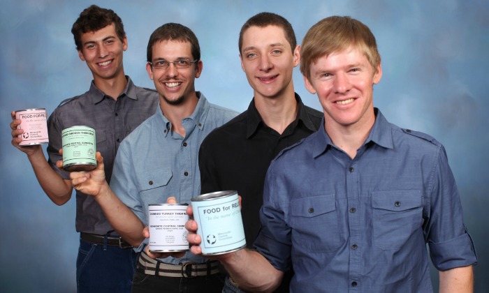 Photo: The 2016-17 canning crew is made up of (from left) Lucas Hiebert from Goessel, Kan.; Matthew Blosser from Goshen, Ind.; Claudio Regier from Neuland, Paraguay; and Carsten Wiebe from Neuland, Paraguay. MCC photo/Brenda Burkholder