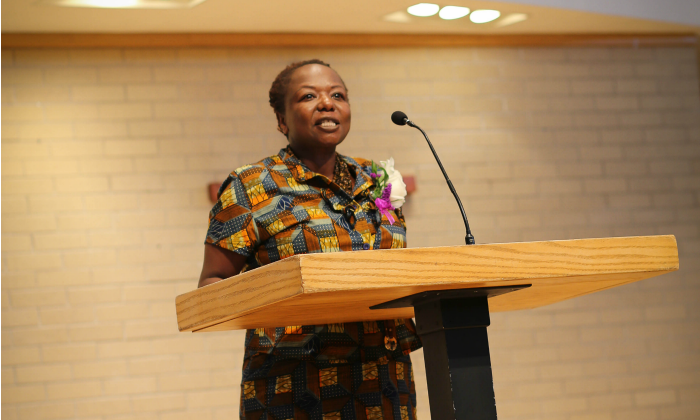 Photo: Ellah Wakatama Allfrey at Goshen (Indiana) College. Goshen College photo.