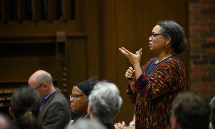 Photo: Dr. Malinda E. Berry, AMBS assistant professor of theology and ethics, interacts with presenter Dr. Sylvia Keesmaat after Dr. Keesmaat’s keynote address, “A Lament for the Land: Romans, Suffering and Hope,” at Rooted and Grounded: A Conference on Land and Christian Discipleship, held Oct. 1–3, 2015, at AMBS in Elkhart, Ind. (Photo by Tyler Klassen)
