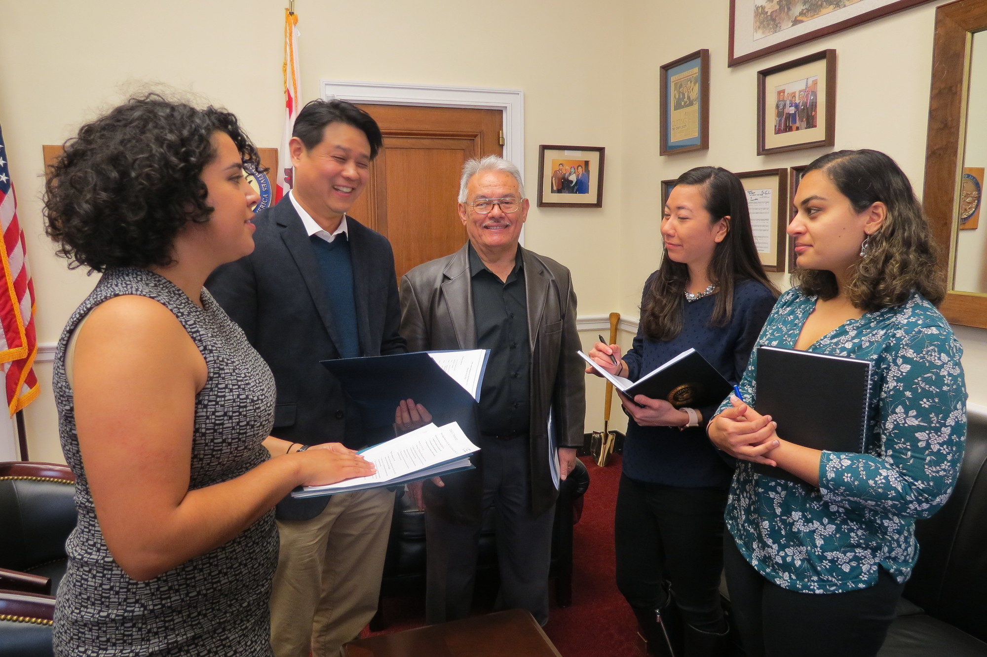 Photo: Danielle Gonzalez, MCC U.S. immigration project coordinator; Hyun Hur, ReconciliAsian; and Samuel Resendez, Iglesia La Roca, speak with California Rep. Judy Chu’s aides Krystal Ka’ai and Rricha Mathur about immigration policies. MCC photo/Rhonda Dueck