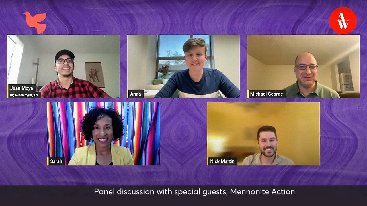 AW: Welcome, everyone. We are excited for tonight’s livestream. My name is Juan Moya, digital strategist of Anabaptist World, and we have very special guests tonight. We have some members of Mennonite Action. Welcome, Anna, Michael, Sarah and Nick. If you can introduce yourselves and share a little bit of your background with Mennonite Action and what roles you have.