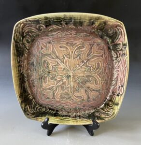 DM: Even more interesting to me than color is surface texture and pattern. Through these I am telling the story of the piece. Subtle hues, variations of color and worn surfaces are what I’m aiming for. If my work is confused with something from an archeological dig, I am pleased.