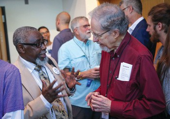 Photo: Musa Mambula, left, of Bethany Theological Seminary talks with Leonard Gross of Goshen. Photo by Brian Yoder Schlabach/Goshen College