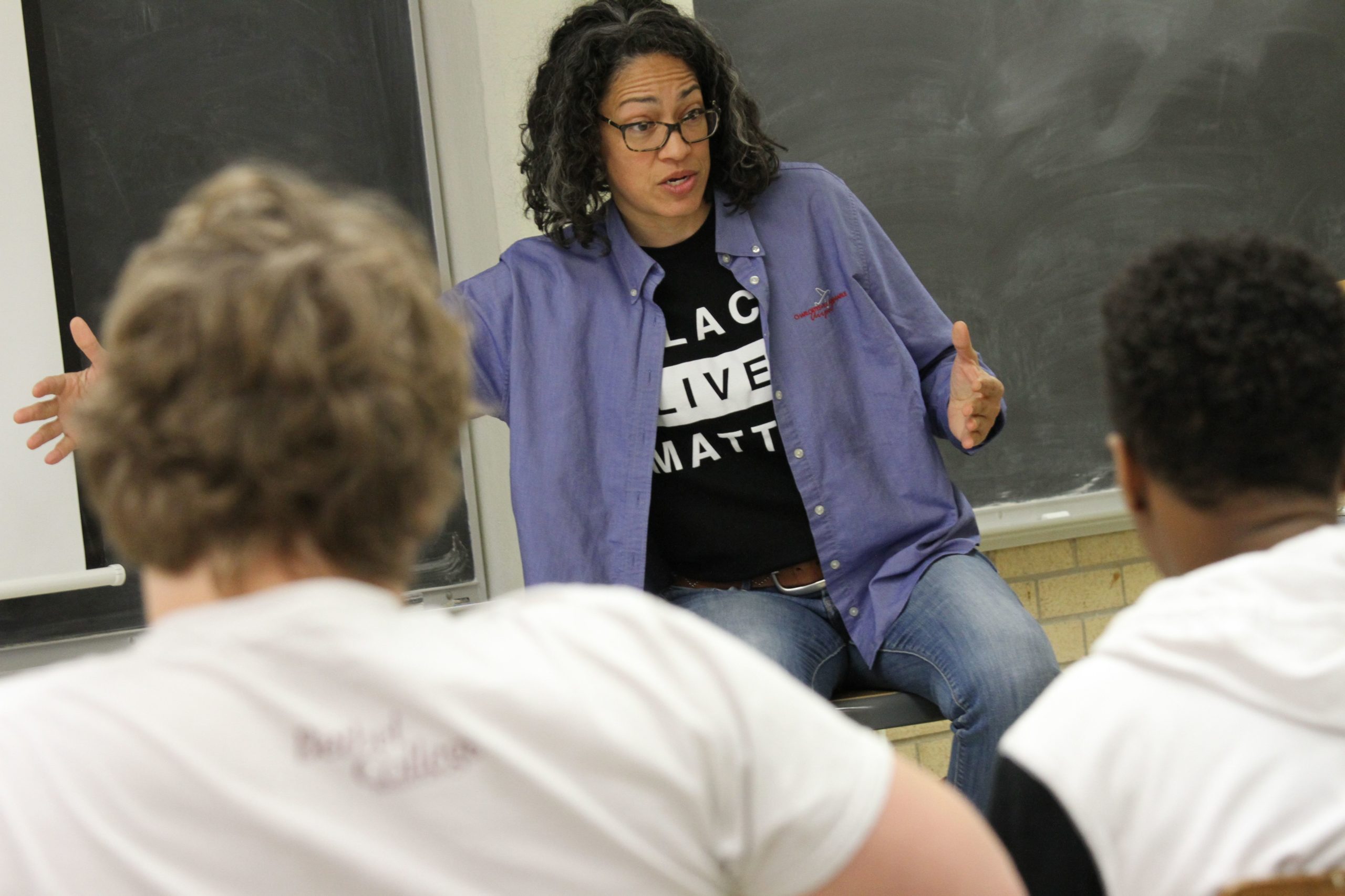 Photo: Jalane Schmidt speaks in a class at Bethel College, North Newton, Kansas. –Bethel College