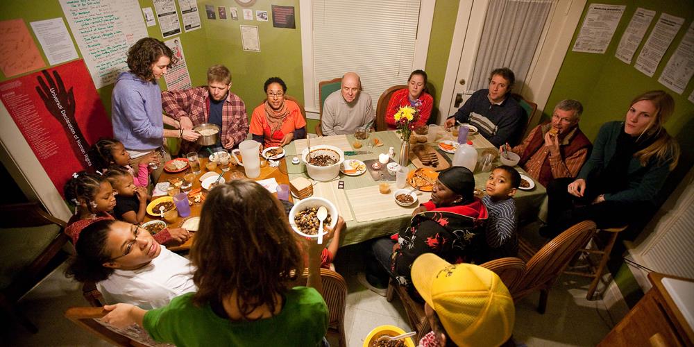 Photo: The Elkhart, Indiana, Mennonite Voluntary Service unit shares a meal with community members in 2008. The Elkhart unit supports a neighborhood bike project, victim offender reconciliation, the local food bank and other community organizations. Photo provided by Mennonite Mission Network.