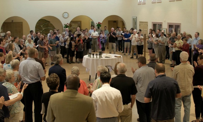 Photo: Members of Central Plains Mennonite Conference gather for communion and worship during their June 2015 annual meeting at Grand View University, Des Moines, Iowa. CPMC photo.