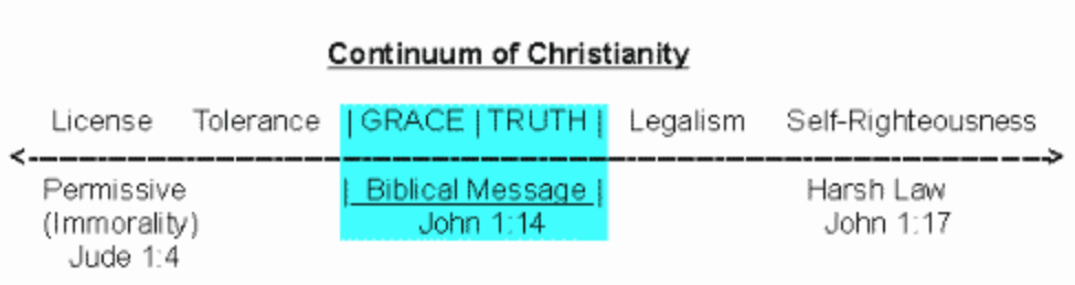 Why are people not following Jesus’ example, i.e. full of grace AND truth? They are following agendas, instead of following Jesus. If we look at the illustration above we’ll see that going towards the right will land us in legalism where the Jewish leaders had positioned themselves with the Talmud. Since Jesus was perfectly balanced with both truth and grace, this was very obvious to him and he wanted to pull them back towards the center. That’s why many of His teachings emphasize grace which was lacking in their understanding of God’s Word. But He never told them to “ignore truth” and “err on the side of grace.” A good example where He taught both truth and grace is in John 8 where he was confronted with the need to judge between grace and truth. The woman caught in adultery was obviously guilty. Instead of ordering them to stone her as the law (truth) ordered, He applied grace: ” … neither do I condemn you.” But He did not ignore the truth factor: “Go and sin no more”.