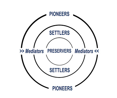 Settlers: These folks are the more or less silent majority in the group in a given conflict, and are not as strongly aligned with either the pioneers or preservers on a particular issue, but may have varying degrees of sympathy for one or the other — or both.