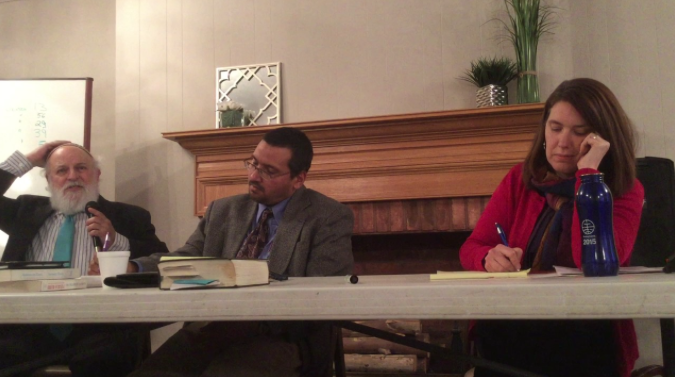 Photo: (l to r) Rabbi Yosef Zylberberg, Imam Shamsuddin Wahid and Mennonite Pastor Paula Snyder Belousek speak during an interfaith panel on peace in Lima, Ohio. Photo provided.