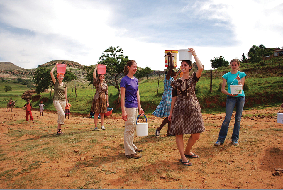 During an interterm in Lesotho and South Africa that included home stays, Bethel College students try their hand (or their heads) at balancing and carrying water the way the village women did. Bethel College photo.