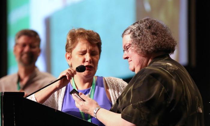 Photo: Elizabeth Soto Albrecht prays with Patricia Shelly, newly installed moderator July 4 at Kansas City 2015. Photo by Mennonite Church USA.