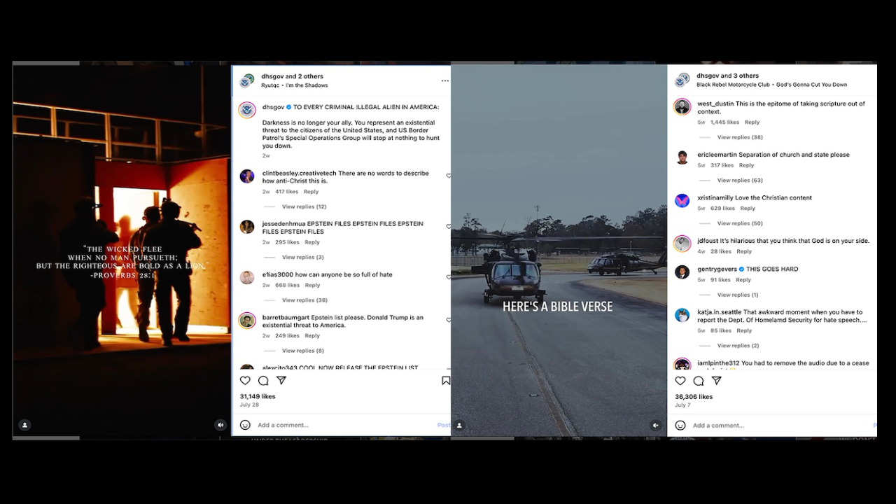 The video received 37,000 likes and had been shared about 9,000 times as of Tuesday (Aug. 19) but irked some X users who were surprised to see a religious text quoted in the governmental agency’s communications. It is one of many posts by the agency since June across Instagram, Facebook and X quoting Scripture or invoking religious imagery to promote its efforts to arrest and deport immigrants.