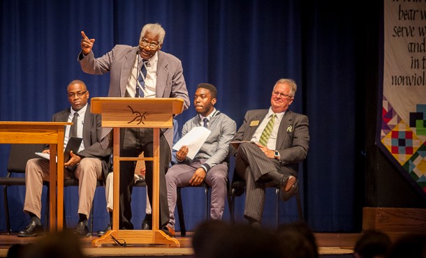 Photo: Dr. Abraham Davis Jr. speaks during a November 2015 chapel service in his honor. Davis was the first director of multicultural services at Eastern Mennonite University in Harrisonburg, Va., from 1980 to 1986. Behind him are (from left) teacher and coach Eric Payne, professor emeritus Titus Bender (not shown), student Philip Watson and President Loren Swartzendruber. (Photo by Michael Sheeler).