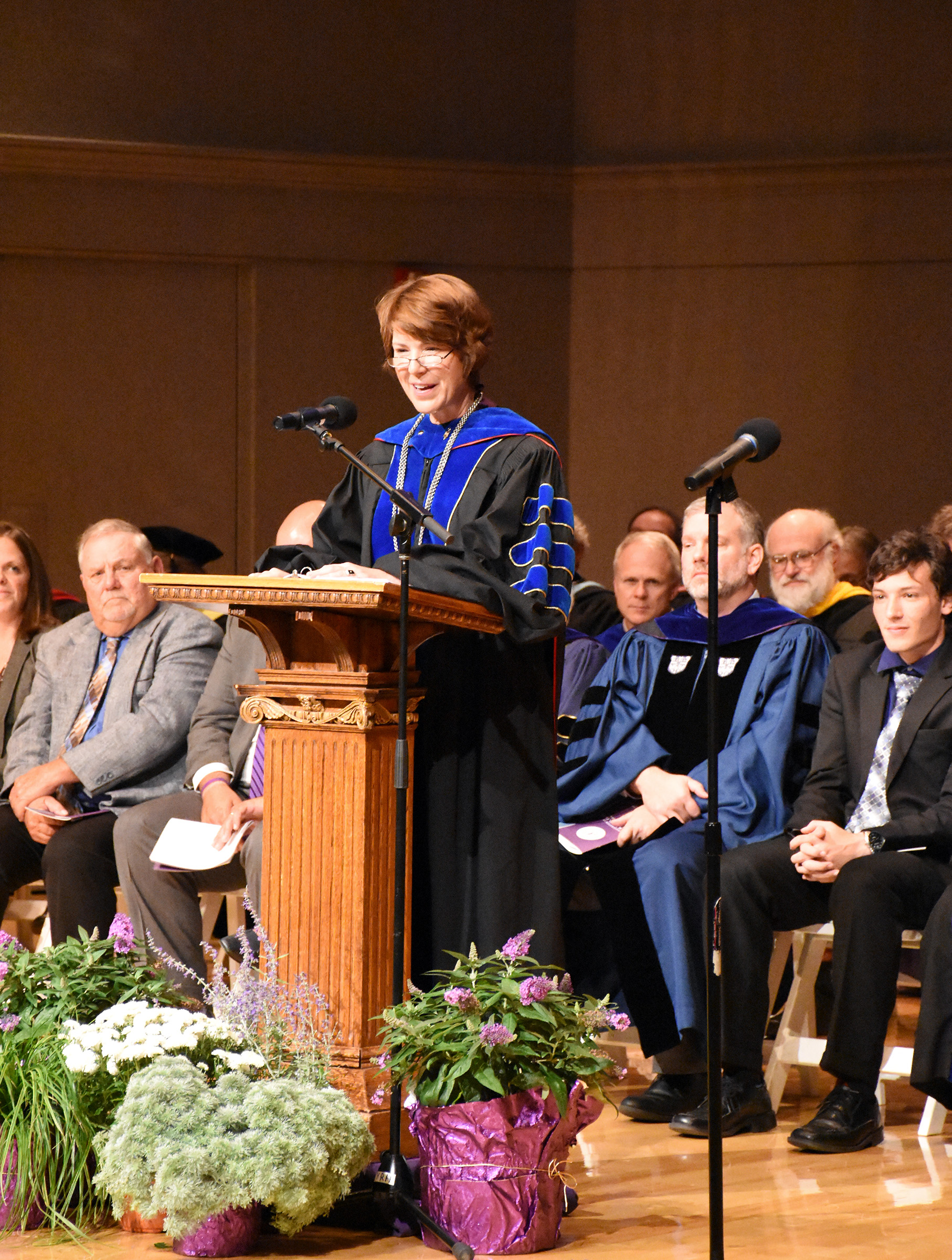 During her inaugural address on Sept. 28, as Bluffton (Ohio) University’s 10th president, Dr. Jane Wood pondered a fact that many people in Yoder Recital Hall may not have realized. Many of this year’s incoming freshmen, the class of 2022, were born in the year 2000. They have lived in a century and a world that has never known life without the internet or Google.