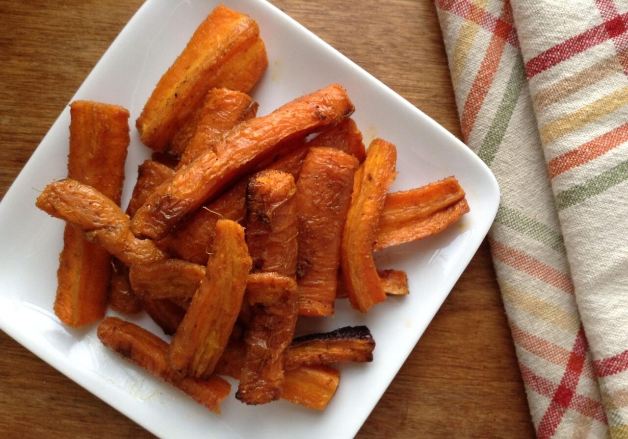 Chop a medley of root veggies (such as sweet potato, carrot, beet, parsnip, radish, potato, onion, turnip) into similar sizes (for even cooking). Toss with a little olive oil and a pinch of salt. Spread veggies out in a single layer on a baking sheet. Cook at 450 degrees Fahrenheit for 30-40 minutes, stirring halfway through for even browning.