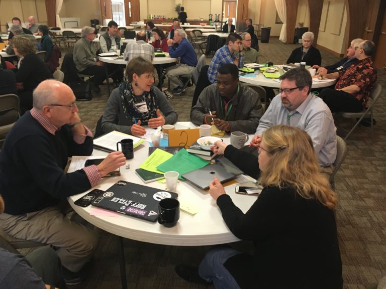-Participantes del CLC debaten en grupos en la Iglesia Menonita de Hesston. Foto por Kayla Berkey.