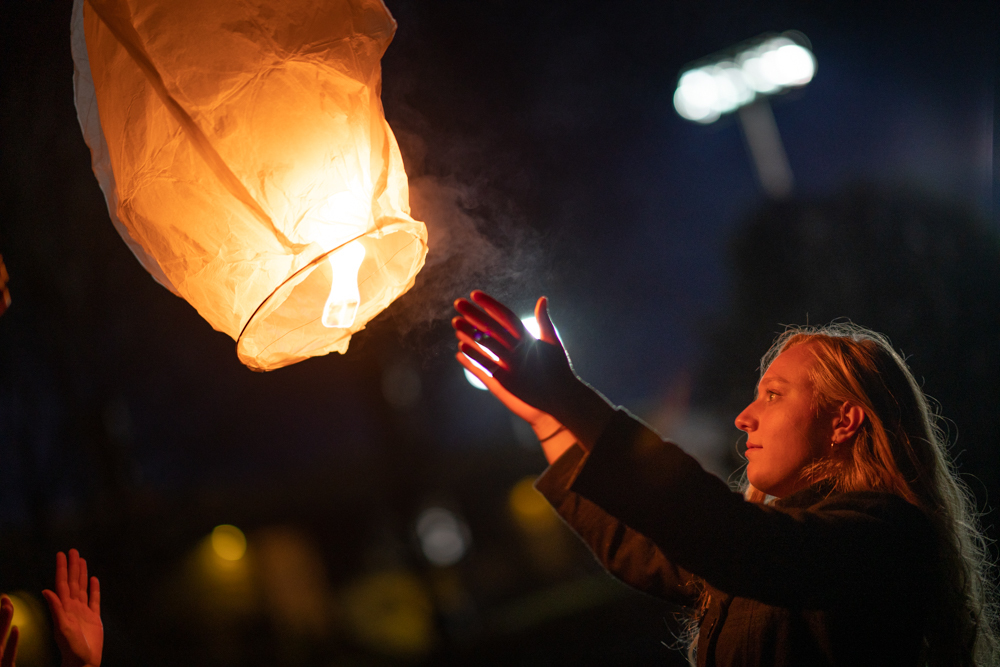 Photo: Undergraduate anatomy students lit and released paper lanterns as part of a memorial service for the four cadavers they dissected and studied this semester. Photo by Macson McGuigan.