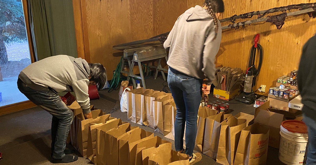 Photo: Jayshaun Bigback (left) and Daejae Spotted Elk give out food to elders in the community from Voices of the Sacred, a nonprofit run by Krystal Two Bulls, executive director. Photo by Krystal Two Bulls