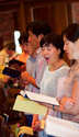 SunJu Moon (center) sings a hymn with others at the opening worship service of this school year at Associated Mennonite Biblical Seminary in Elkhart, Ind. DongJu Park, her husband, is on her right. Photo by Peter Ringenberg