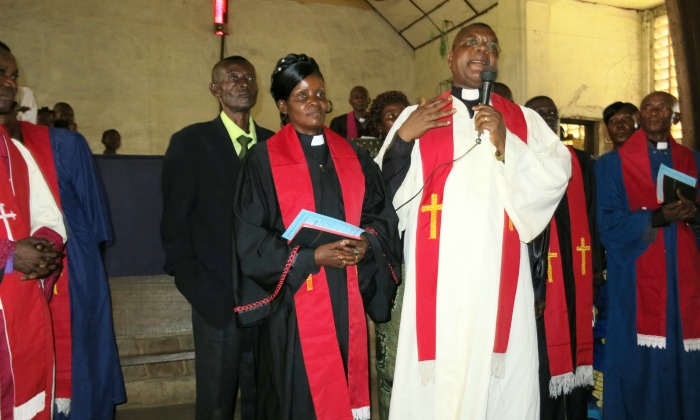 Photo: Bercy Mundedi was one of the first three women ordained by the Mennonite Church of Congo in 2013. Here in the chapel at Kalonda Bible Institute where Mundedi has taught for 10 years, Adolphe Komuesa Kalunga, national president of the denomination, presides over her ordination. Photo taken by Sandy Miller.