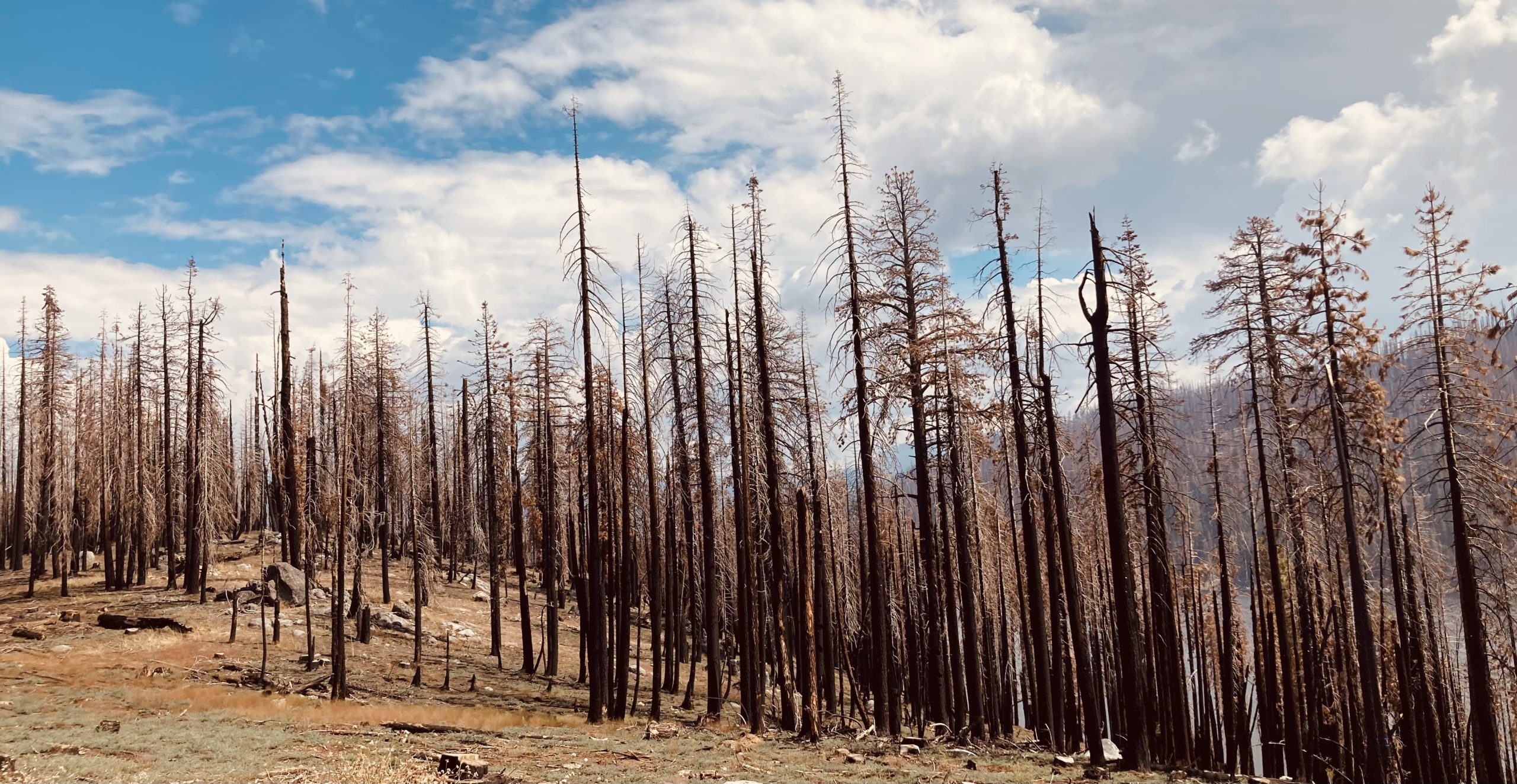 Ashen stumps, blackened trunks, charcoal forest floor. We are driving to Huntington Lake and Camp Keola in the high Sierras and the detritus of a 2-year-old fire landscape confronts us with its warning of the impact of global warming.