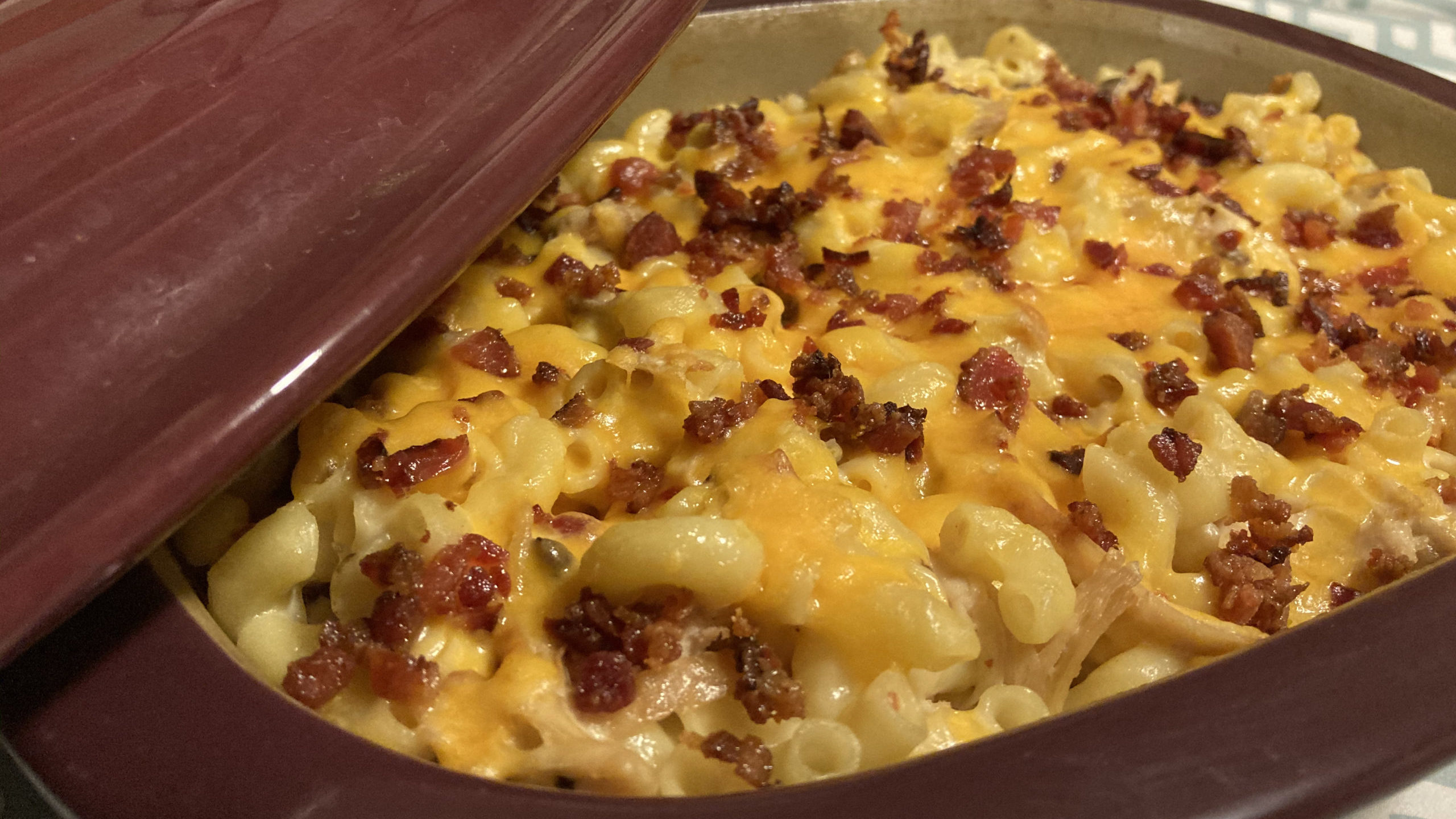 I’m a proud rural Midwesterner. My accent, food taste, and even my personality (ope, yeah no, sorry!) reeks of the fields of corn and soybeans that I grew up around. It took a long time for me to admit that I can tell what kind of manure a farmer is using just by the smell. That said, I do love a good casserole and this one combines mac n’ cheese, bacon, and chicken. It’s easy, a bit processed (ope, sorry!) and fantastic for cold nights when you just want to hibernate with a loved one. The only thing that would make this more Midwestern is if it were covered in ranch (please don’t do that).