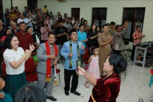 Pastor Teguh Karyanto, Ustadz Rachmannudin, public officials and the congregation sing and dance together during a Christmas celebration in 2025. —Teguh Karyanto