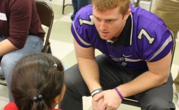 Bluffton (Ohio) University football player Brad Swavel talks with a student at Padua Academy in Indianapolis during a shoe distribution at the school Jan. 27.