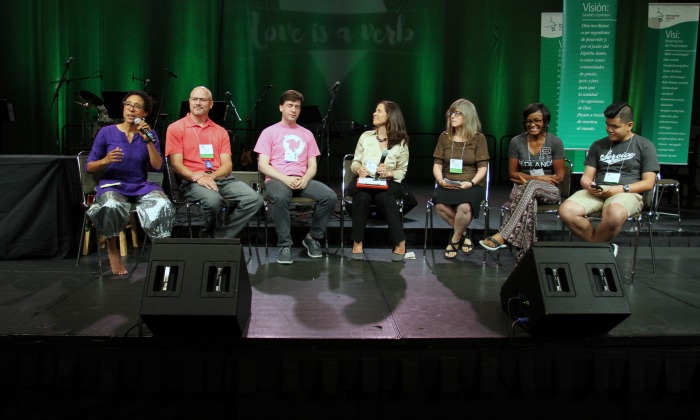 The next exercise was a “Samoan circle,” which involves a group of six people sitting in a circle and conversing during a plenary session. People can move out of the circle after they speak. Barnes asked people to come to the front and respond to the following questions: What are the implications of our diverse identities within church? Can we live with our differences? Do we choose to do so?