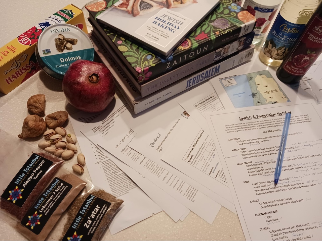 In putting together the menu, I’ve been poring over both Jewish and Palestinian cookbooks, interlibrary borrowing every title I can get my hands on, as well as researching traditional holiday foods and customs of Jews and Palestinians. It has been a joy to learn more about Middle Eastern cuisine and discover their commonly used flavors and ingredients (which I rarely use) such as pine nuts, figs, apricots, pomegranate, rose water, orange blossom water, za’atar and sumac.