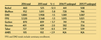 Enrollment at Eastern Mennonite University in Harrisonburg, Va., is down slightly from 1,908 to 1,880. Undergraduates are up from 1,224 to 1,260, but full-time undergraduates are down slightly from 1,087 to 1,081.