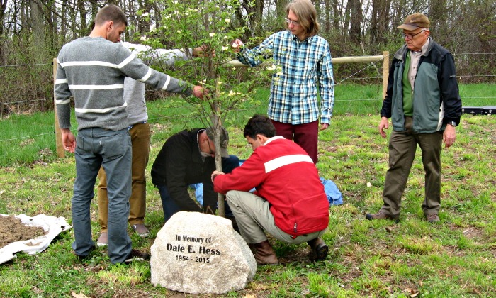 Merry Lea Environmental Learning Center staff, along with friends and family of Dale Hess, gathered in an orchard at Merry Lea’s Rieth Village April 27 for a committal service and burial of his ashes.
