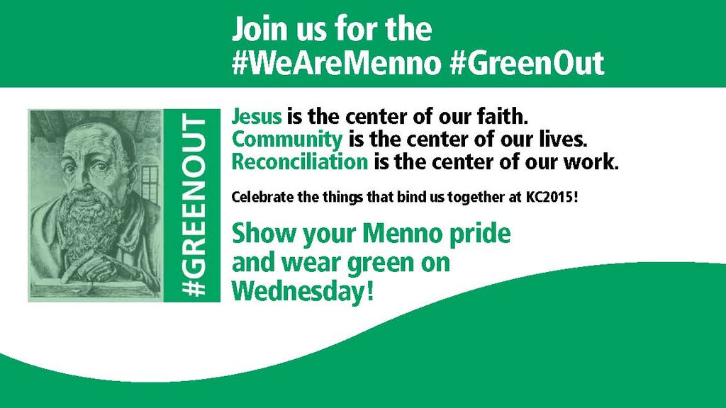The official convention hashtag is #MennoCon15 and any photos posted on social media can be tagged #MennoGram. It would be great if people all across the church—not just those at convention—would take Wednesday to wear green and to pray together for God’s spirit to be present at convention and across the denomination.