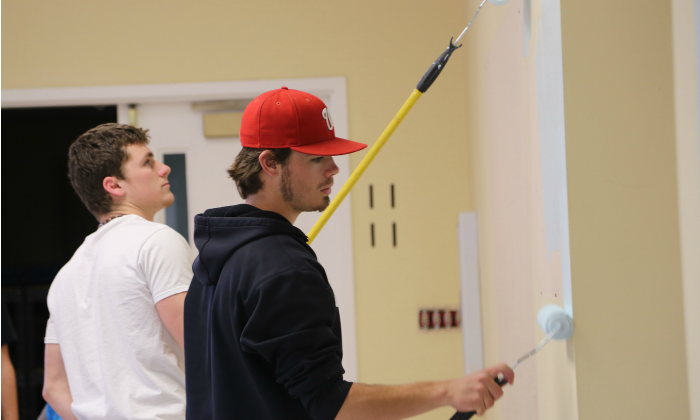 Photo: Hesston (Kansas) College students Weston Schroeder (Harper, Kansas) and Daulton Horton (Denton, Texas), paint at the Mennonite Central Committee Central States office (North Newton, Kansas) as part of their Larkfest service project. All on-campus students participated, with about 275 students at 35 service assignments. Photo provided by Hesston College.