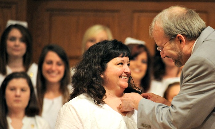 Kristal Potter, a 2014 Hesston College nursing graduate, receives her nursing pin from faculty member Gregg Schroeder during the May 2014 nursing pinning ceremony. Photo provided.