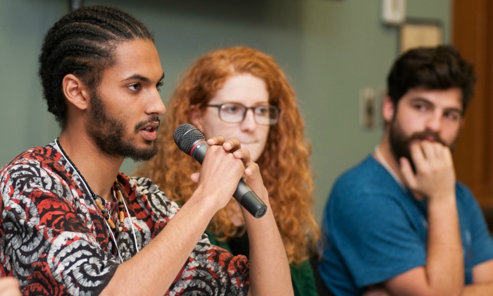 Photo: Malcolm Stovall ’17 (left), Laura Miller ’17 and Marco Fraticelli ’18 take part in a student panel during the Minority Ministries Council Conference. (Photo by David Fast/Mennonite Mission Network)