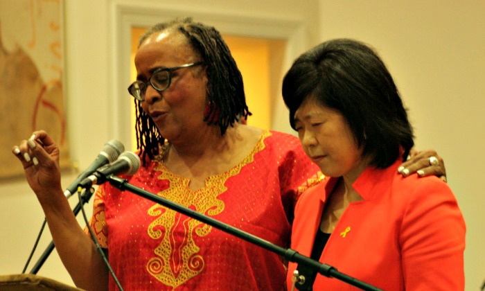 Michelle Armster, the interim executive director of MCC Central States, prays over Sue Park-Hur, who preached the closing sermon on Sunday at Hope for the Future. Photo by Carol Roth.