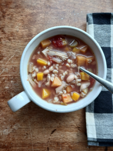 A warm and welcome meal, this makes use of the season’s harvest. This soup is endlessly adjustable with veggies you have on hand. The protein can be all beans, exclusively turkey/chicken or a mix of the two. I make this whenever I have a poultry carcass, as homemade broth is wonderful and honorably uses all the edible parts of the bird (amazing how much more meat falls off the bone after a long slow simmer).