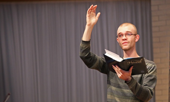 Photo: Bobby Switzer, a senior molecular biology/biochemistry and peace, justice and conflict studies double major from Berne, Indiana, leads a hymn during a Goshen College chapel service. Photo by Brian Yoder Schlabach.