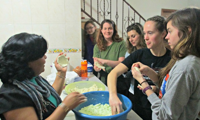 A lesson in tortilla-making in Mexico during the Bethel College interterm class Social Development and Social Justice, January 2015; from left: Bethel students Tia Goertzen, Koki Lane, unidentified non-student, Leah Mueller and Regina Hafner. Photo by Austin Regier.