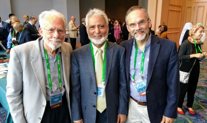 Photo: Eastern Mennonite Missions Christian/Muslim Relations Team member David Shenk, Sayyid Syeed, the former national director of the Islamic Society of North America’s Office of Interfaith and Community Alliances, and CMRT member Andres Prins stand together at this year’s June 30–July 3 ISNA Convention in Chicago. Syeed invited the team to come to the convention for the second consecutive year, this time with 2,500 copies of Shenk’s co-authored book “A Muslim and a Christian in Dialogue” to hand out as a gift. Photo provided.