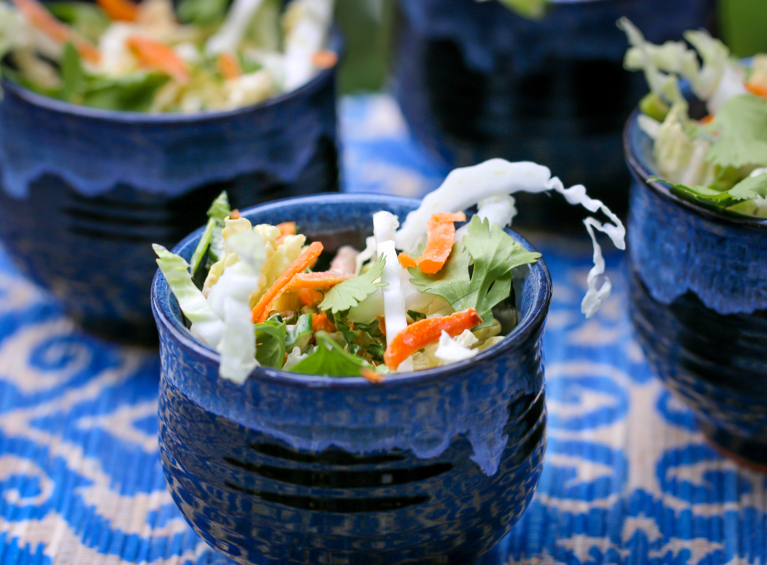 - In another bowl, combine the coleslaw mixture (cabbage, carrot, green onions and cilantro). Pour the dressing over the cabbage mixture and toss to combine. Serve immediately.