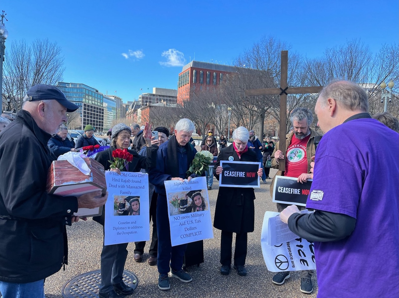 The coalition organizing the protest, which calls itself the Lenten Ceasefire Campaign, included Churches for Middle East Peace; Congregation of Our Lady of Charity of the Good Shepherd, U.S. Provinces; Dorothy Day Catholic Worker; Festival Center; Franciscan Action Network; Friends of Sabeel North America; Maryknoll Office for Global Concerns; National Advocacy Center of the Sisters of the Good Shepherd; National Council of Churches, USA; Palestinian Christian Alliance for Peace; Pax Christi USA; Quixote Center; Sisters of Mercy of the Americas – Justice Team; Sojourners; United Church of Christ; and the Women’s Alliance for Theology, Ethics, and Ritual.
