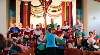 Hyattsville Mennonite Church lead pastor Cynthia Lapp directs a choir during the congregation’s worship service celebrating 30 years of LGBTQ inclusion on June 12. — Kate Stoltzfus
