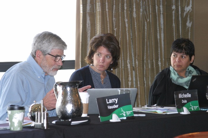 Photo: Mennonite Church USA Executive Board members (from l to r) Larry Hauder, Michelle Dula and Margie Mejia-Caraballo. Photo by Paul Schrag/Mennonite World Review.