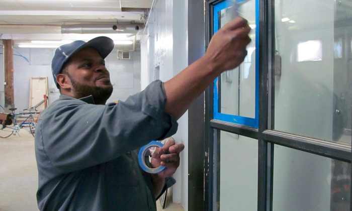 Photo: Ed Jackson prepares a door to be painted as part of Kingdom Builders Construction’s (KBC) renovation of a North Philadelphia auto repair shop. Jackson is the construction manager for KBC, an MCC East Coast partner that offers a chance for former prisoners to learn vocational skills while providing construction services to congregations, businesses and individuals in the greater Philadelphia area. (MCC Photo/Rachel Sommer).