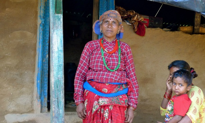 Photo: Mancauri Biswakarma stands outside her damaged house with her daughter Rita and grandson Roshi. After their other house collapsed in the earthquake, Mancauri’s family of 10 must now live together in one room in this much smaller house. Most of the roof collapsed and has been replaced with a tarp. MCC Photo/Luke Reesor-Keller.