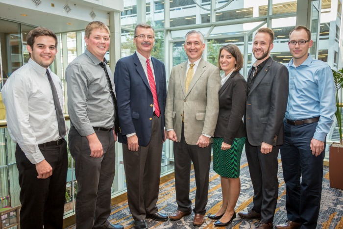 Photo: Five recipients of MEDA’s 20 Under 35 Award gather with Everence staff at the MEDA Convention in Richmond, Va. From Left to Right: Alex Miller; Rylan Miller; Rod Diller, senior vice president for Everence; Ken Hochstetler, President and CEO, Everence; Kaylie Tiessen; Jirah Dueck; and Andrew Yantzi. Photo provided.