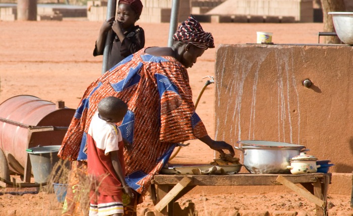 A woman in Burkina Faso prepares food. If crops are not planted at the beginning of rainy season (May and June), families will go hungry in the coming year.